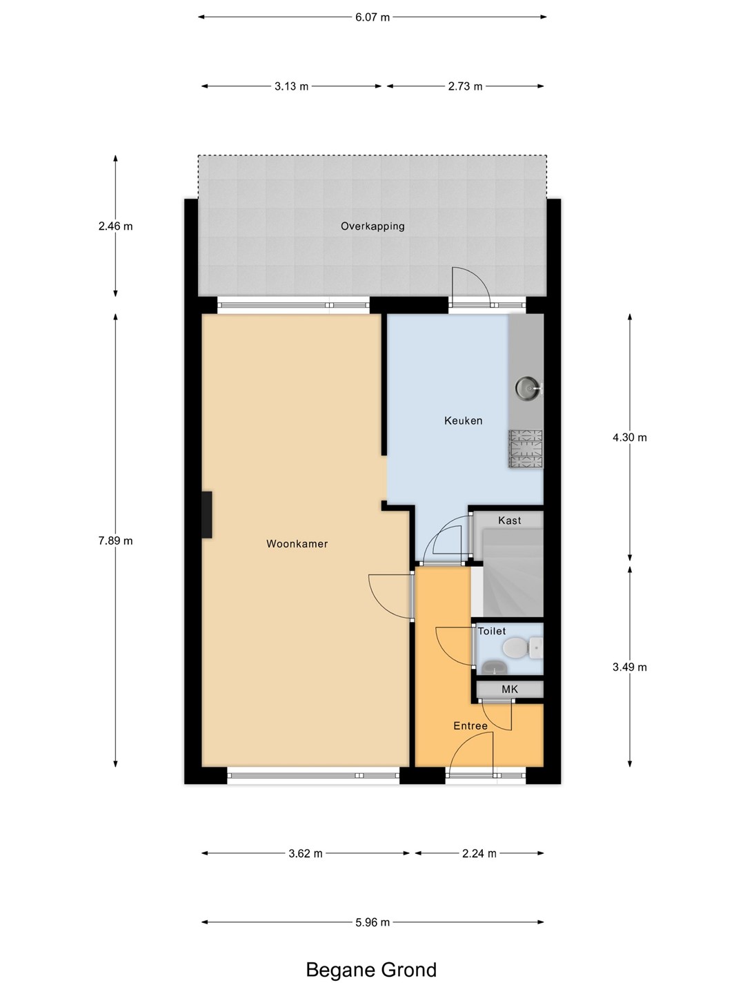 Entree/hal met meterkast, plavuizen vloer en gestuct plafond. De toiletruimte is deels betegeld en voorzien van een staand toilet en fonteintje. De woonkamer heeft een plavuizen vloer en een gestuct plafond. De dichte keuken is voorzien van diverse inbouwapparatuur (5-pits gasstel, oven, magnetron, afzuigkap) en biedt toegang tot een trapkast en de achtertuin door middel van een loopdeur.