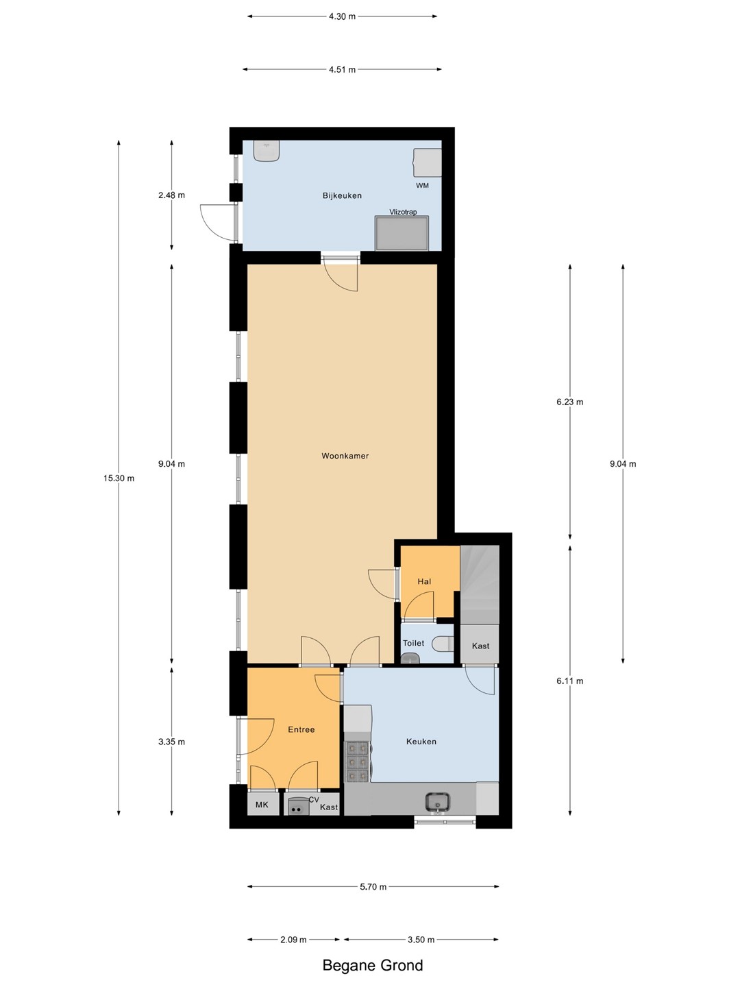 Entree, ruime hal (met meterkast en cv-ruimte), ruime woonkamer, keuken (met inbouwkast), wasruimte (met trap), halletje (met toilet en trapopgang).