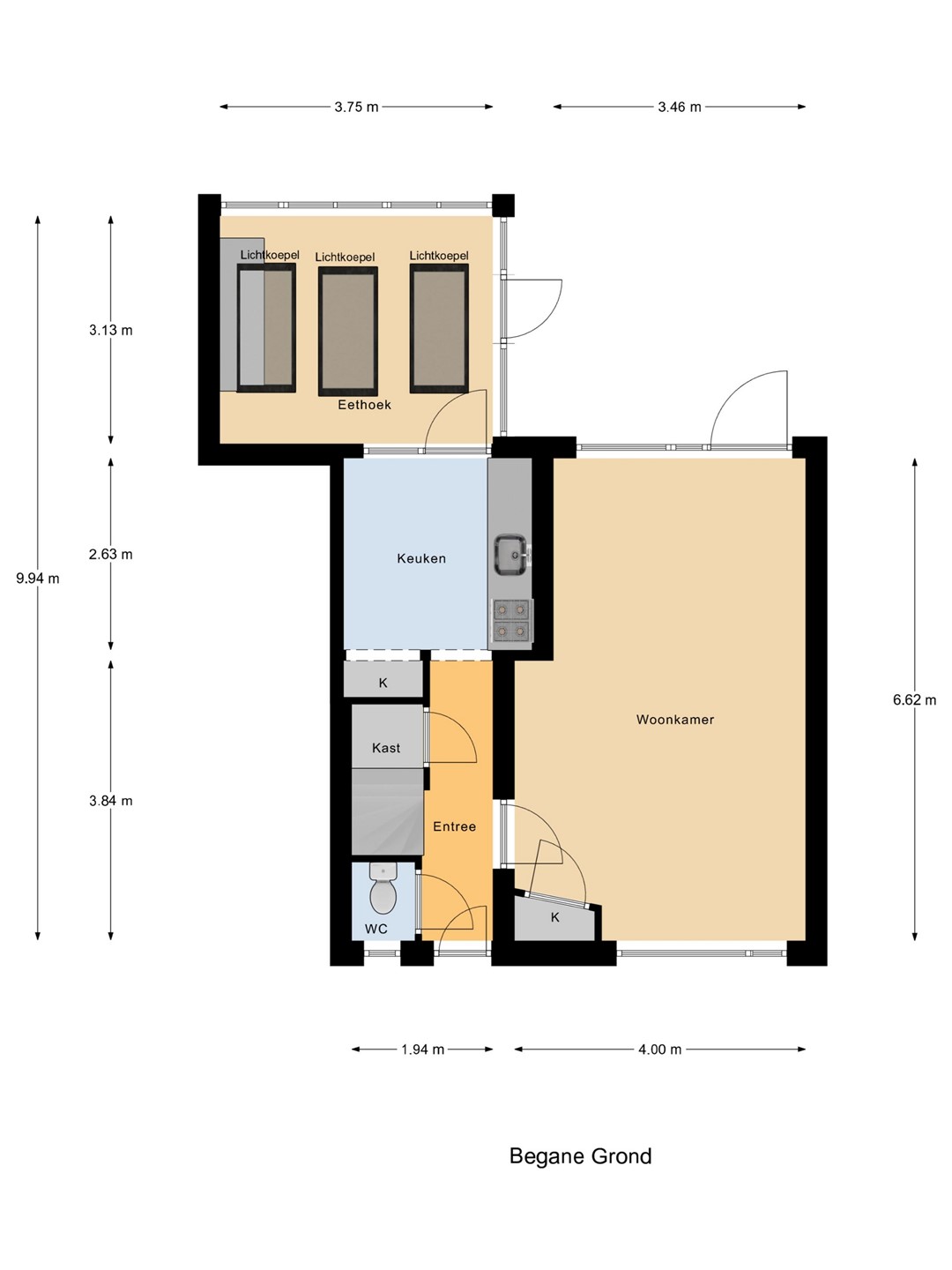 Bij binnenkomst kom je in de hal met meterkast (8 groepen), een praktische kelderkast voor extra voorraad en de toiletruimte. De lichte doorzonwoonkamer is voorzien van een handige inbouwkast en geeft direct toegang tot de achtertuin. De dichte keuken beschikt over diverse inbouwapparatuur en een extra bergkast. Vanuit de keuken bereik je de eenvoudige serre, een ideale plek om al vroeg in het voorjaar van de eerste zonnestralen te genieten.