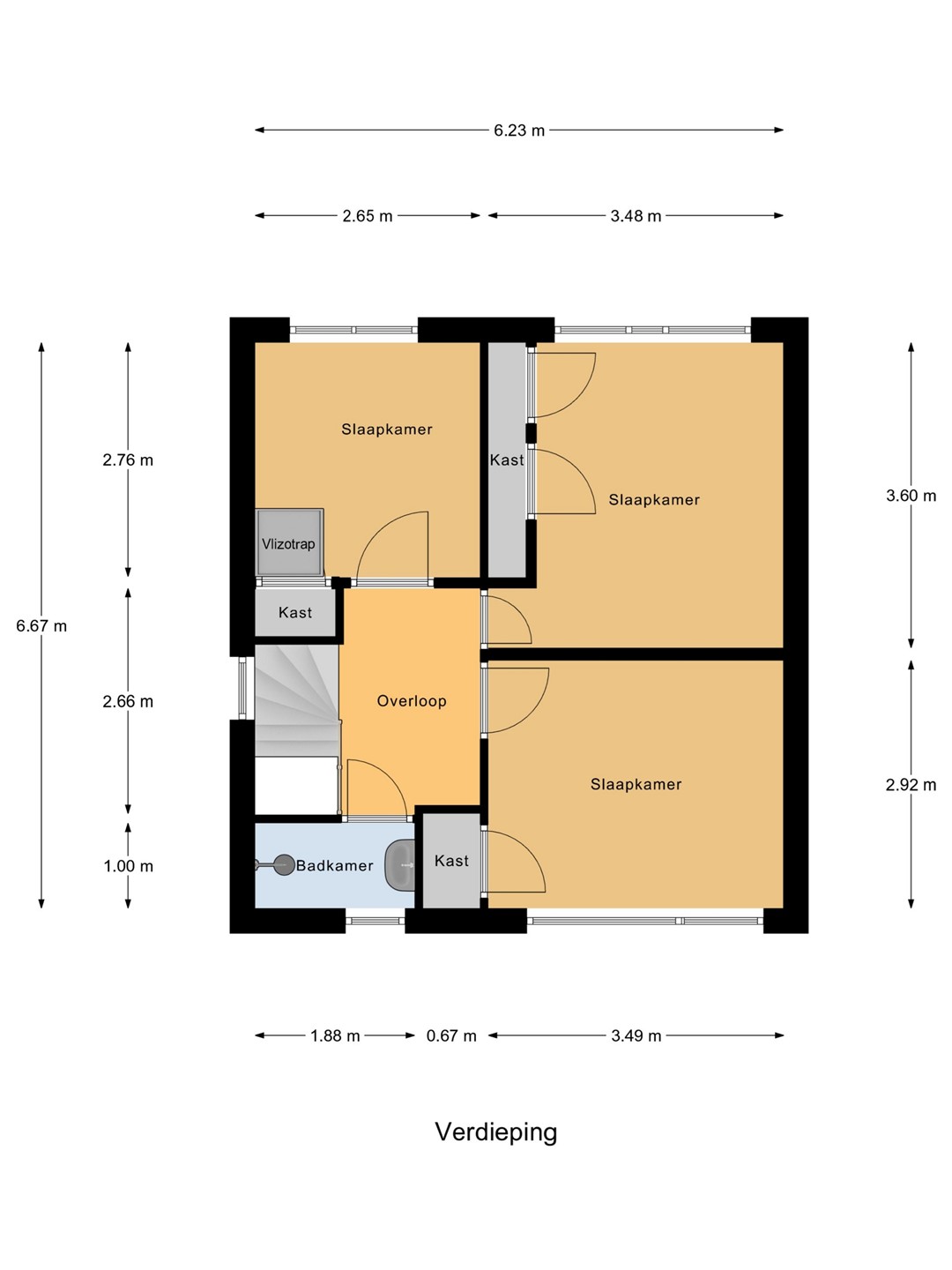 De overloop met extra bergkast biedt toegang tot drie slaapkamers. Alle drie de slaapkamers zijn praktisch ingedeeld en beschikken over een eigen inbouwkast. De badkamer is functioneel ingericht met een douche en een wastafel.